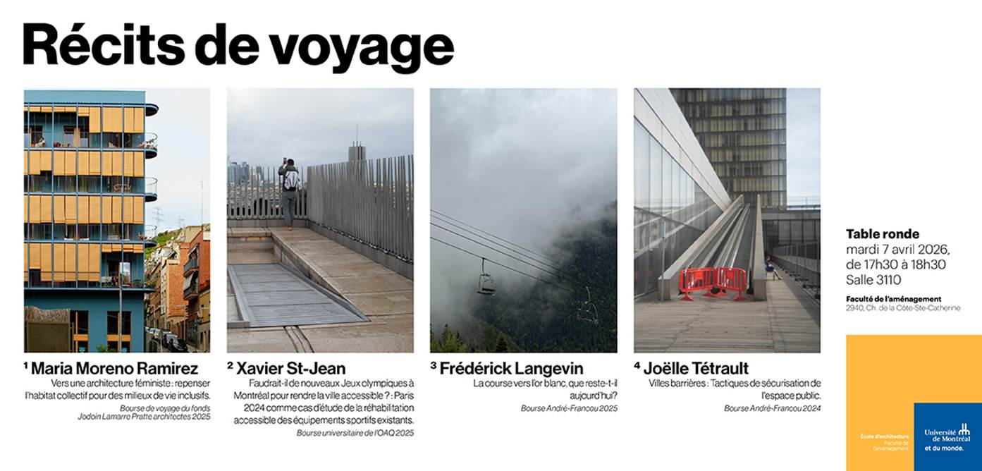 Date: Tuesday, April 7, 2026 Time: 5:30 p.m. to 6:30 p.m. Location: Room 3110 Event moderated by Paloma Castonguay-Rufino, PhD candidate at the Canada Research Chair in Architecture, Competition, and Quality (CRC-ACQUA) and the Laboratoire d'Étude de l'Architecture Potentielle (LEAP) Travel narratives serve as tools for capturing the various aspects of the travel experience, as a form ... Read more